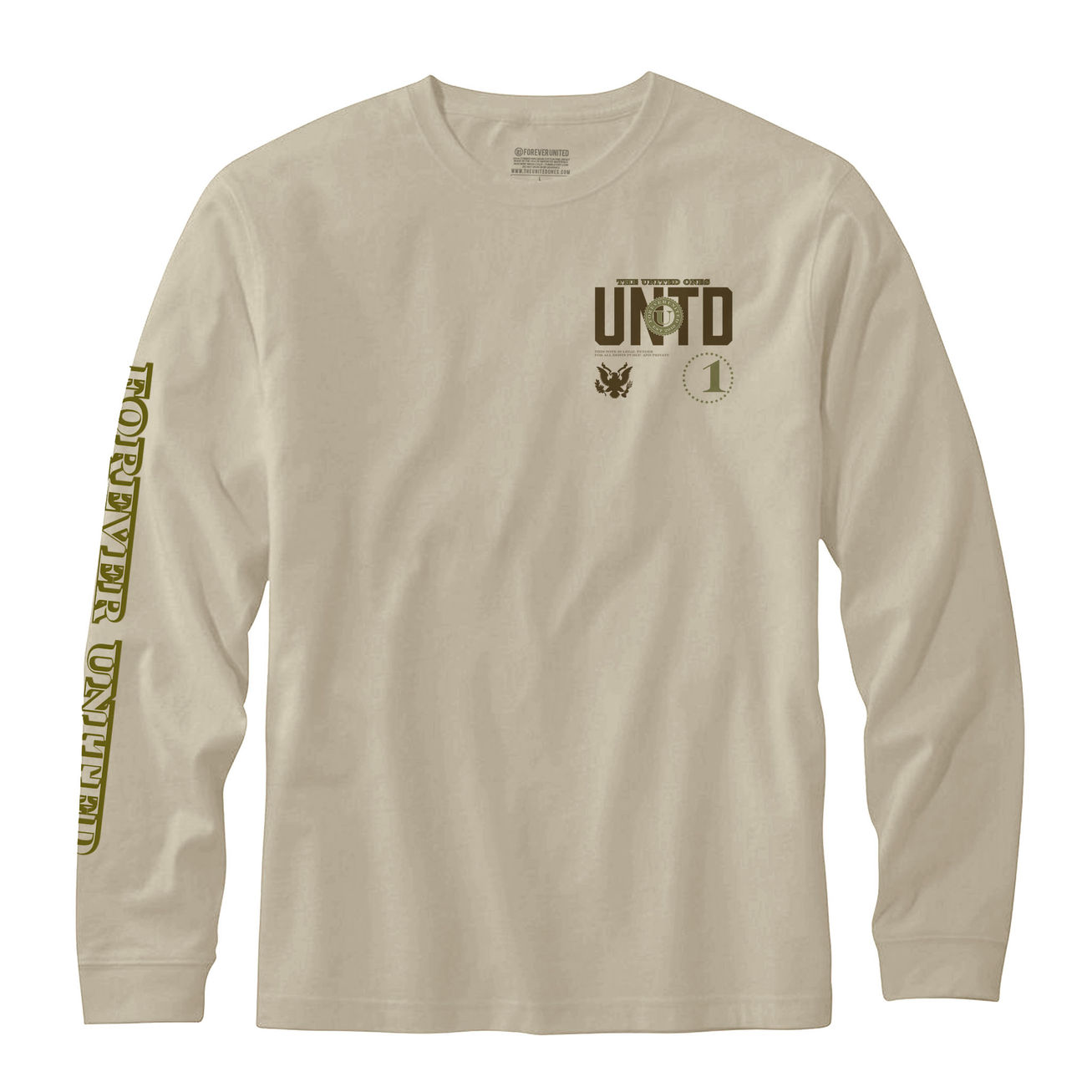 Forever United "Trust Fund" graphic printed on long sleeve shirt. Left chest and sleeve print.